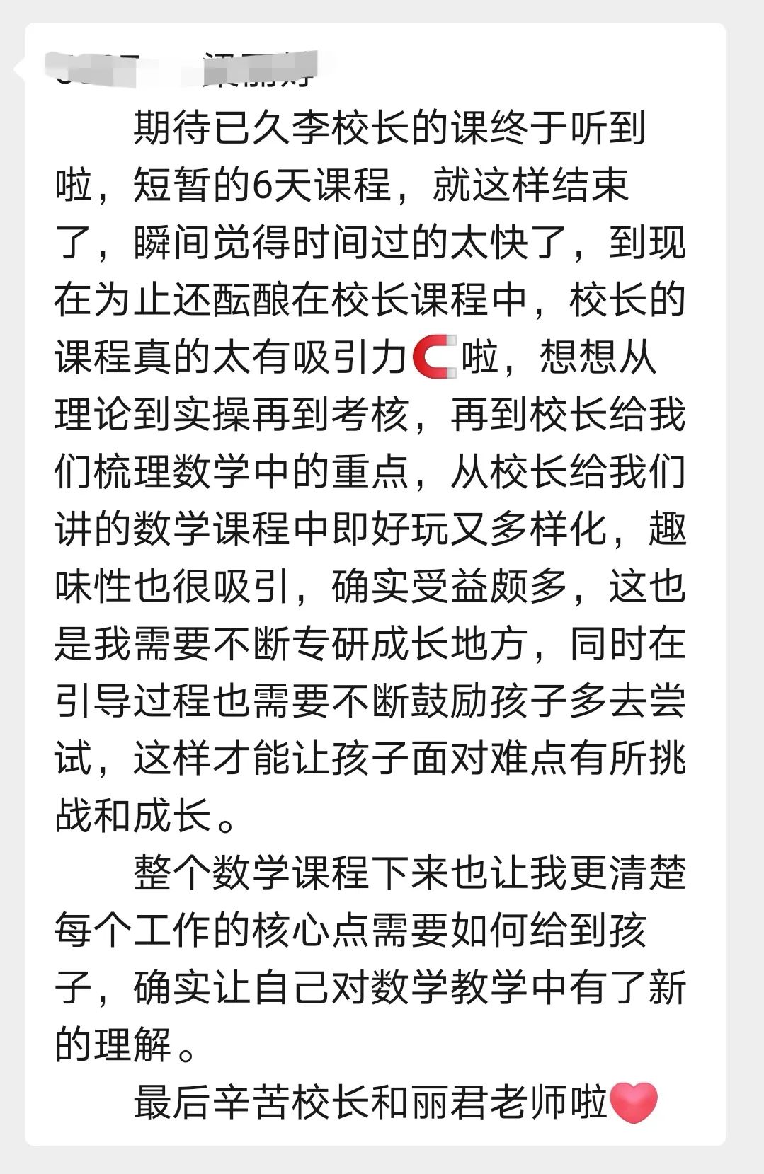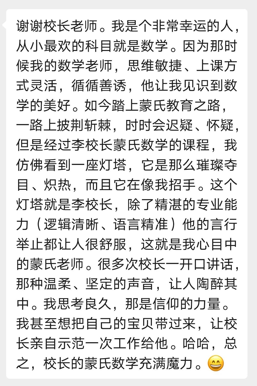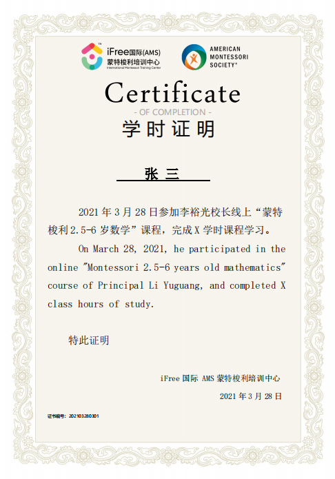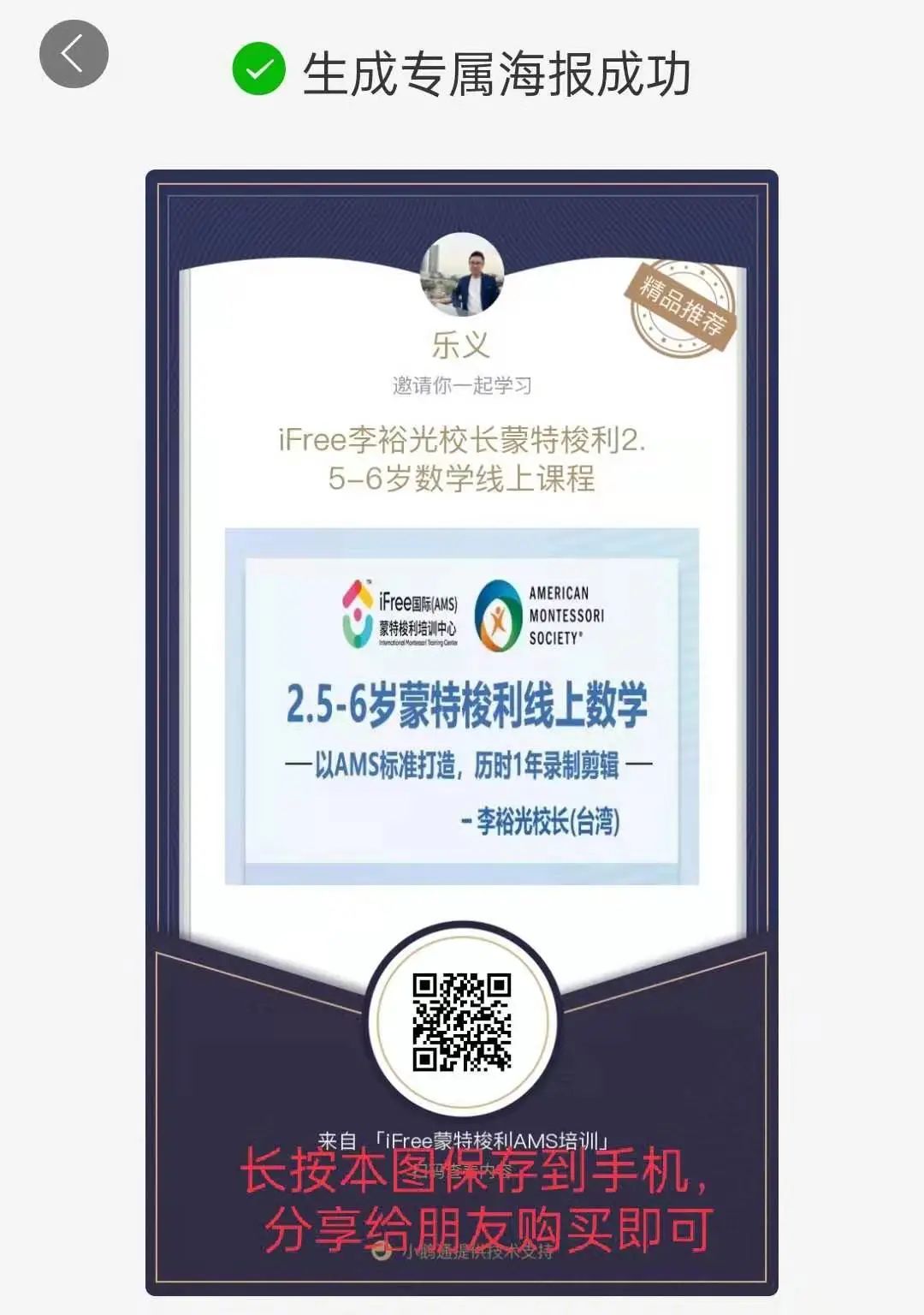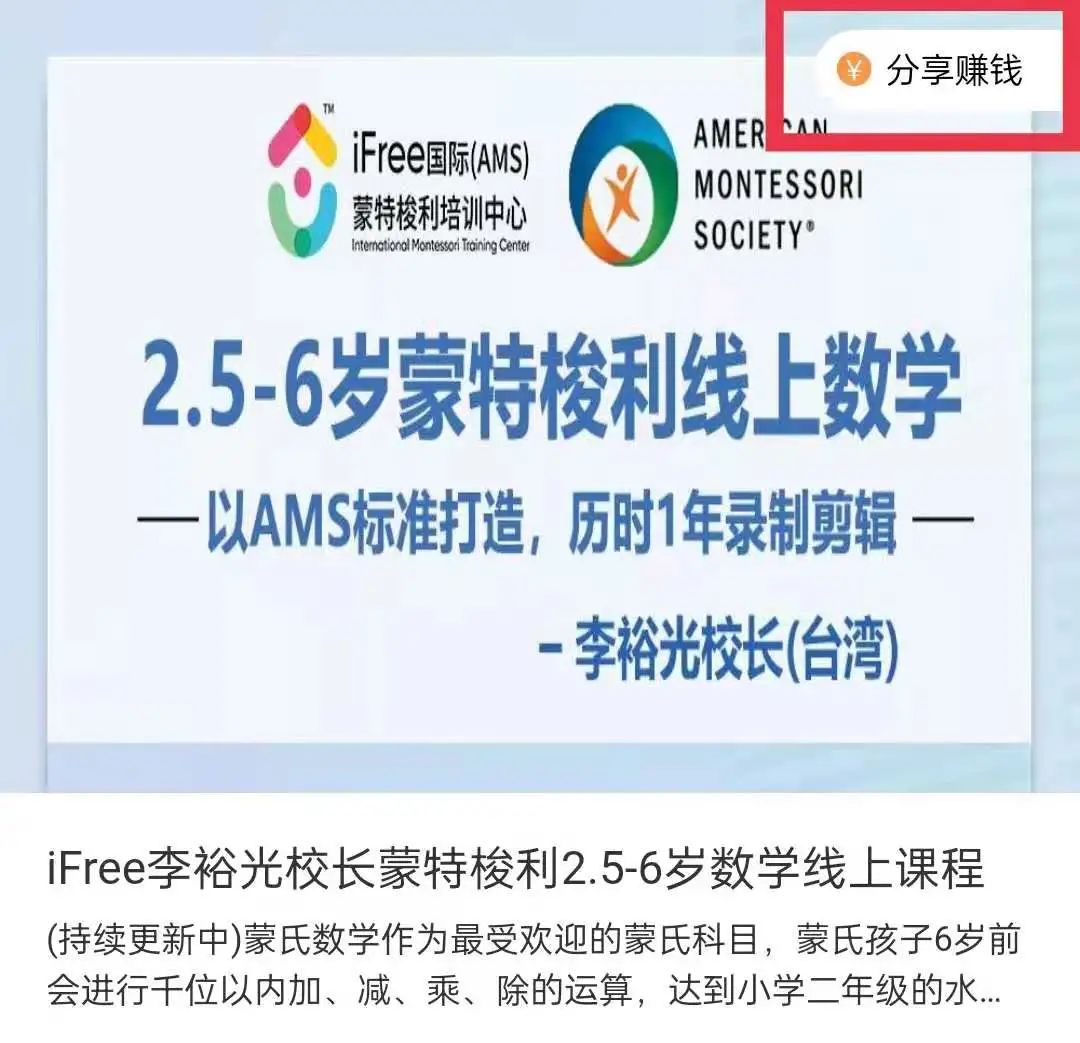 蒙特梭利2.5-6岁数学线上课程 iFree国际AMS蒙特梭利中心邀请亚洲蒙特梭利协会会长李裕光校长以国际AMS标准录制了线上数学课程。 ![]() 蒙特梭利将抽象枯燥的数学知识“实物化”,用高效的教具操作、验证,产生爆发性的学习成果。 李裕光 主讲人 亚洲地区蒙特梭利协会会长 台湾蒙特梭利教师协会第一届理事长 iFree国际蒙特梭利培训中心资质导师 台北昶心蒙特梭利小学创校校长六年 美国圣母学院AMS蒙特梭利教育研究所毕业 加拿大多伦多蒙特梭利AMI3-6岁教师资质 美国华盛顿蒙特梭利AMI6-12岁教师资质 著作 蒙特梭利教育实践(大学用书) 台北华杏出版社 新世纪的教育(翻译)(Education for A New World) 台北及幼出版社 人的成长(译着审定)(蒙氏原著:Formation of Man)台北及幼出版社 全人教育(译着审定)(Paula Polk Lillard 原著)台北及幼出版社 面向人群 ![]() 蒙特梭利领域从业者 想了解蒙特梭利数学教育家长 早教中心老师或幼儿园老师 培训内容: ![]() 业内泰斗级导师 李裕光校长是亚洲蒙台梭利协会会长,是亚洲地区最早接触学习蒙台梭利教育的人之一。 李裕光教授常年在亚洲各地推广蒙台梭利教育,享受极高的声望,被誉为亚洲蒙台梭利教育界的泰斗! 在极高的威望面前,李校长对每一节蒙氏课程有着最纯粹的谦卑和敬畏。 ![]() 看看学员们的评价吧。 ![]() ![]() ![]() ![]() ![]() 蒙氏数学:丰富教具+皮肤记忆 数学是抽象性、逻辑性很强的学科。孩子需要用具体的形象事物去学习,蒙氏数学教具就符合这种特点,将抽象的数学概念物化、具体化在教具上,让孩子调动所有感官去看、去摸,运用自己的大脑去分析、推理,自己发现问题再解决问题。完全理解后,又能从具体回归到抽象中。 ![]() ![]() 课程内容:理论+教具操作展示,共66个视频(专业录制5天AMS标准数学课) 资质证书:学习时长超过90%,可扫码联系工作人员,申请电子学时证书 费用优惠:原价3999元,现推广价仅需1999元 后续福利:参加线下数学培训,可优惠培训费1000元 ![]() ![]() 扫码咨询课程详情 分享得198元佣金 推广专业AMS课程 分享链接给好友购买线上课程 本人可获得198元的10%佣金福利 ![]() 如何生成你的推广海报 扫描下方二维码进入课程界面 ![]() 点击“分享赚钱” ![]() 生成个人专属海报 ![]() ![]() 长按图片保存至相册 并分享给好友 好友通过你的推荐链接购买 ![]() 你即可获得小鹅通平台实时到账的 10%佣金福利 iFree全年培训安排 iFree教育旗下心田儿童之家,13年来专注于纯正蒙氏教育,拥有4家直营园所,接受过凤凰卫视&深圳卫视采访。 2019年沉淀升级创办iFree国际AMS蒙特梭利培训中心,已开办7期AMS2.5-6、3期AMS0-3,汇聚全球资深AMS、AMI导师团队提供高质量培训及园所指导,让蒙氏教育走进每个家庭。 ![]()